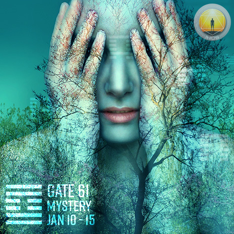Gate 61 is the pressure to know, to unravel the mystery, and to inspire with unique moments of absolute recognition. This knowing moves us toward deeper levels of self-acceptance where we can embrace what distinguishes us from others. We love to spend time musing, and mentally delving into the unknown. When we 'know' that we have a unique insight, and wait for the right time to express it, we feel liberated. When our knowing inspires, empowers, or mutates others, we feel empowered. Compared to the Collective mind, which is either focused on what happened in the past or predicting what may happen in the future, our Individual mind yearns for silence now, for all the voices and dialogue to stop. If we give in to the intense pressure, and let the unknown haunt us, our inspiration can become confused by delusion, leading to deep uncertainty and anxiety. The secret is to enjoy our thoughts and let our inner knowing, our inner truth, reveal itself in its own unique timing. Without Gate 24 we are not designed to solve the mystery, but simply to enjoy it.
